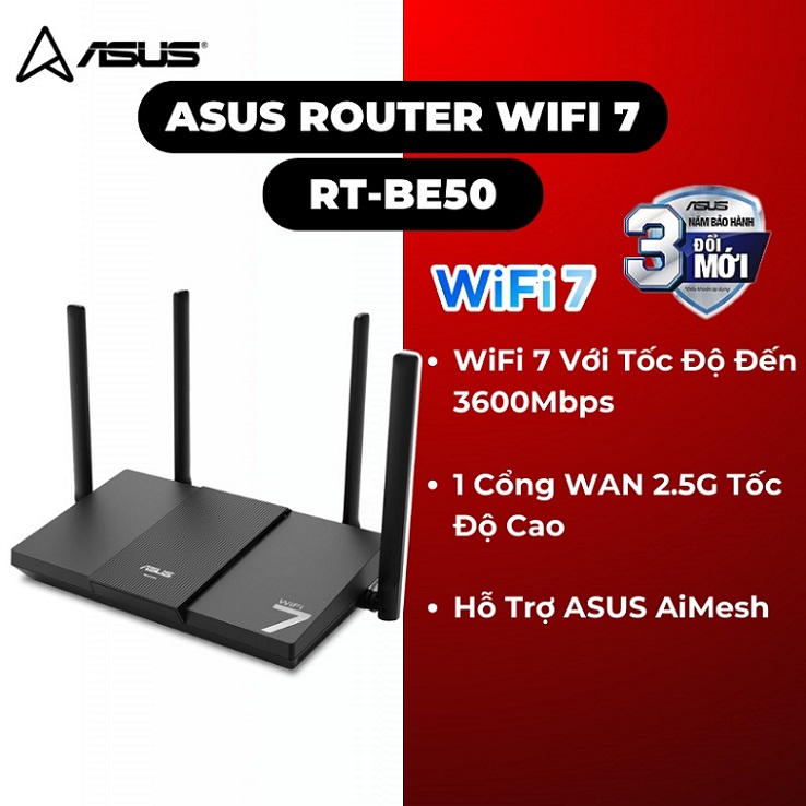 | Bộ phát wifi 7 Asus RT-BE50 (Chuẩn BE/ BE3600Mbps/ 4 Ăng-ten ngoài/ Wifi Mesh/ 45User) | ||||