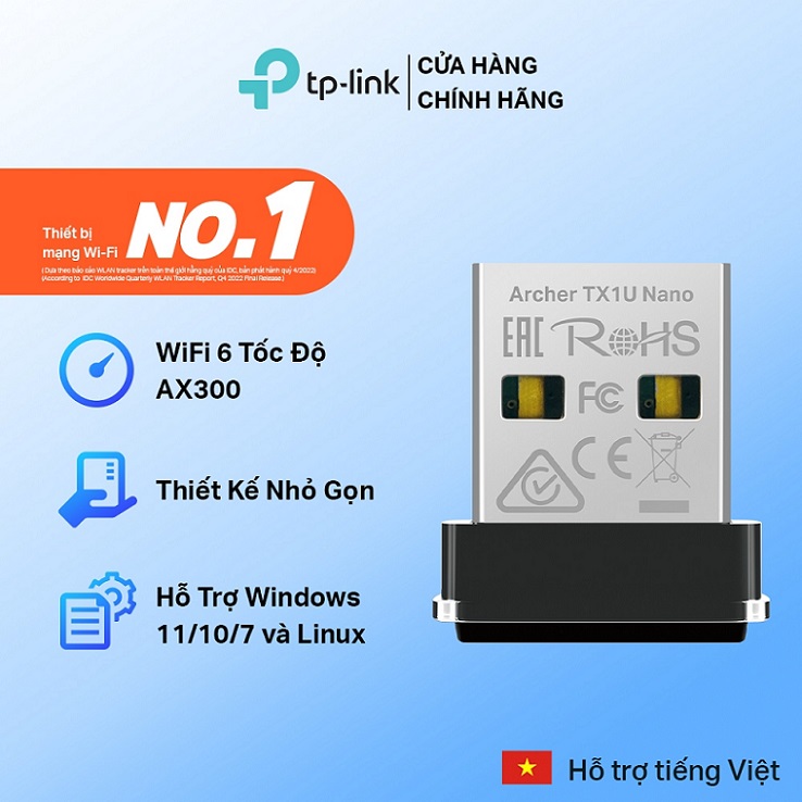 USB WiFi 6 TP-Link AX300 Archer TX1U Nano là một giải pháp nâng cấp kết nối không dây nhỏ gọn nhưng vẫn đảm bảo hiệu suất mạnh mẽ. Với thiết kế siêu nhỏ, khả năng cắm là chạy và hỗ trợ công nghệ tiên tiến, sản phẩm này lý tưởng cho người dùng cần Wi-Fi nhanh chóng.