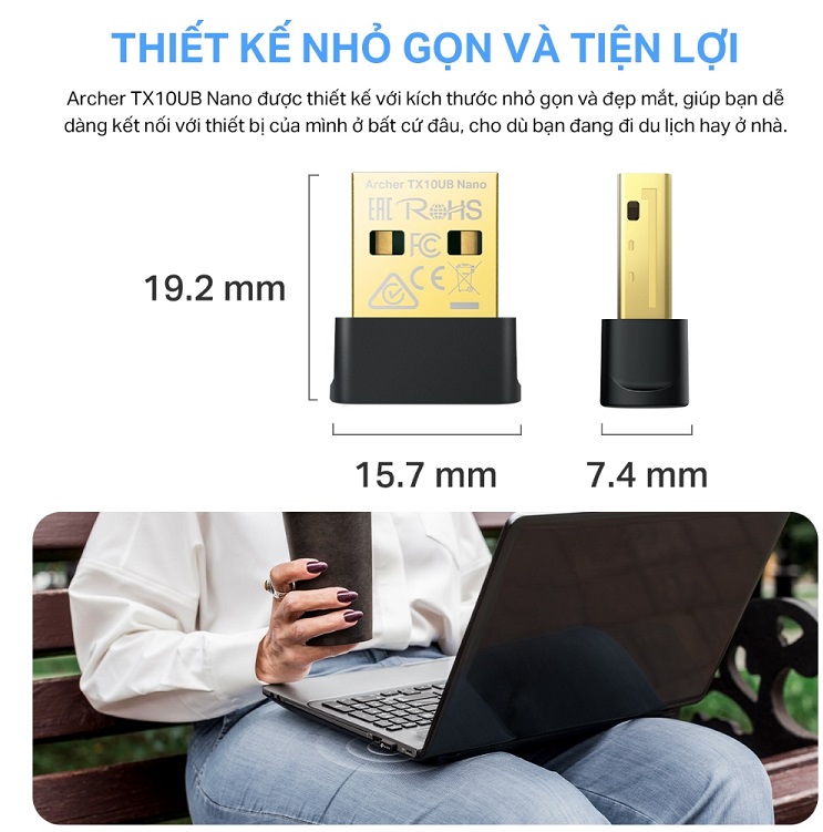Với kích thước chỉ khoảng 1.75×1.57×0.71 cm, Archer TX1U Nano rất nhỏ nhắn khi cắm vào cổng USB, không gây vướng víu khi mang theo laptop. Thiết kế siêu nhỏ không chỉ tiện lợi khi làm việc từ xa mà còn lý tưởng cho các chuyến du lịch.